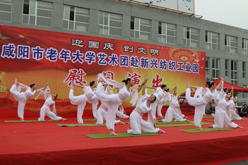 9月28日,在慶祝中華人民共和國(guó)成立67周年之際,咸陽(yáng)市老年大學(xué)藝術(shù)團(tuán)走進(jìn)基層,為生產(chǎn)一線(xiàn)的紡織工人們進(jìn)行精彩的慰問(wèn)演出。 藝術(shù)團(tuán)的演員們?yōu)槁毠け硌萘烁栉、?dú)唱、時(shí)裝表演、瑜伽表演等節(jié)目,并與現(xiàn)場(chǎng)觀(guān)眾進(jìn)行互動(dòng),嘹亮的歌聲,歡快的舞蹈,古風(fēng)古韻的時(shí)裝表演,贏(yíng)得了在場(chǎng)200多名職工觀(guān)眾的熱烈掌聲。