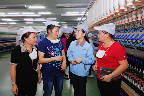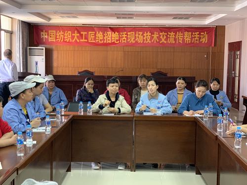 事跡報告會后,中紡政研會、中國財貿輕紡煙草工會等領導,何菲以及另外兩位受邀工匠來到南寧錦虹棉紡織有限責任公司生產車間,與前紡細紗、設備維修、電氣檢修等崗位的職工一起,詳細交流操作、工藝、技術、產品等問題,就“如何提高細紗擋車操作技術”,“如何調整細紗搖架壓力分配”等問題進行了深入探討,并結合自身崗位實踐心得和經驗進行技能傳幫,幫助他們提高生產效率,更好的為崗位奉獻。
