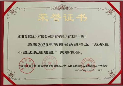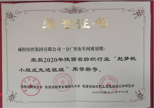 本次會(huì)議上,集團(tuán)公司共有五個(gè)先進(jìn)班組和兩個(gè)先進(jìn)個(gè)人榮獲殊榮,分別是:一分廠織部車間質(zhì)量組、二分廠紡部車間細(xì)紗工序乙班三組、子公司秦越紡織織部車間織布工序丙班榮獲“全國(guó)紡織行業(yè)創(chuàng)新型班組”榮譽(yù)稱號(hào);一分廠織部車間質(zhì)量組、二分廠織部車間織布工序甲班一組、子公司秦越紡織織部車間織布工序甲班榮獲“2020年陜西省紡織行業(yè)‘趙夢(mèng)桃小組式先進(jìn)班組’”榮譽(yù)稱號(hào);二分廠織部車間指導(dǎo)工趙莉絨(女)、子公司秦越紡織紡部車間梳棉保全工嚴(yán)鴿榮獲“2020年陜西省紡織行業(yè)‘夢(mèng)桃式最美奮斗者’”榮譽(yù)稱號(hào)。集團(tuán)公司向獲得表彰的先進(jìn)班組和個(gè)人表示熱烈的祝賀!