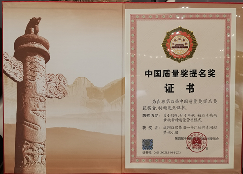 咸陽紡織集團(tuán)一分廠紡部車間趙夢桃小組以“勇于創(chuàng)新、甘于奉獻(xiàn)、精益求精的夢桃精神質(zhì)量管理模式”,喜獲“中國質(zhì)量獎提名獎”。集團(tuán)公司黨委書記、董事長范振華受邀參會并領(lǐng)獎。