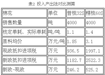 舉例:安徽的新政下,純棉普梳及精梳單耗分別以1.1和1.4計算,下面以單紗生產(chǎn)企業(yè)C為例進行測算,2013年企業(yè)C生產(chǎn)30支純棉精梳紗和60支純棉普梳紗各4000噸,該兩種產(chǎn)品實現(xiàn)全部銷售,且該兩種產(chǎn)品實際生產(chǎn)單耗比較接近核定單耗,通過測算,現(xiàn)政抵扣的進項稅分別為937萬元和1997萬元,以安徽省公告中新政的投入產(chǎn)出法計算,2013年企業(yè)C該兩種產(chǎn)品可予以抵扣的進項稅額分別1182和2522萬元,見表2。